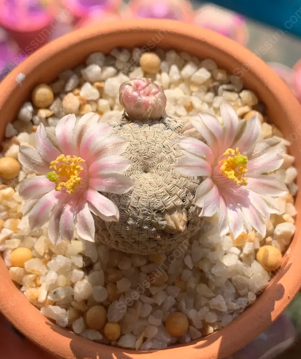 The slow mastoid is a small spherical cactus with a compact body and a soft white thorny hair on the surface of the sphere, which looks like it is wrapped in a thin layer of snow, fresh and unique. Its flowers are small corollas of light pink or white, which surround the top of the sphere when in full bloom, forming an elegant visual effect.