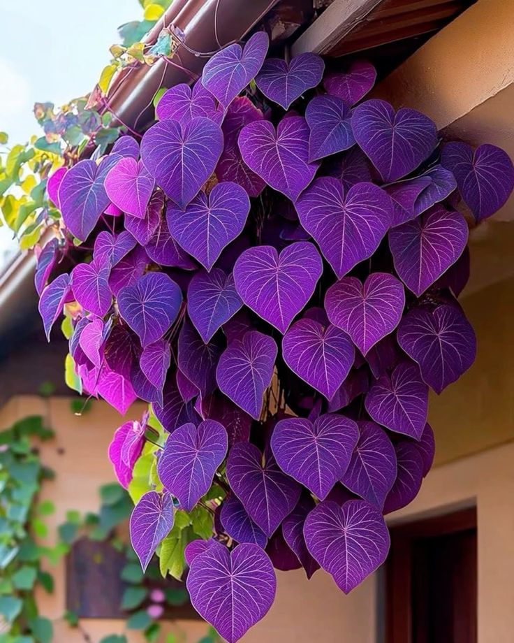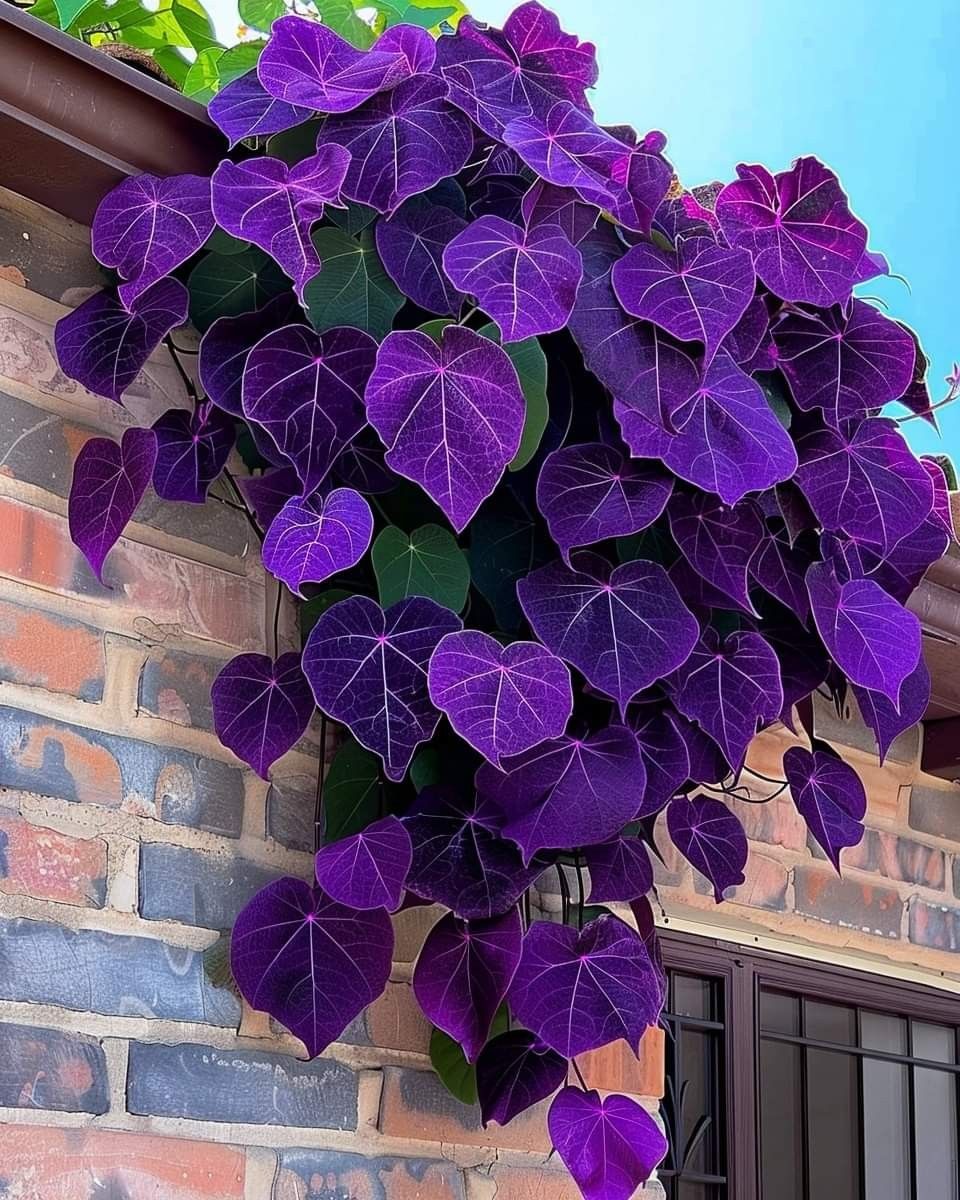Introducing the Purple Heart Vine (Ipomoea batatas 'Blackie'), a striking vine that is sure to captivate with its deep, vibrant purple heart-shaped leaves.