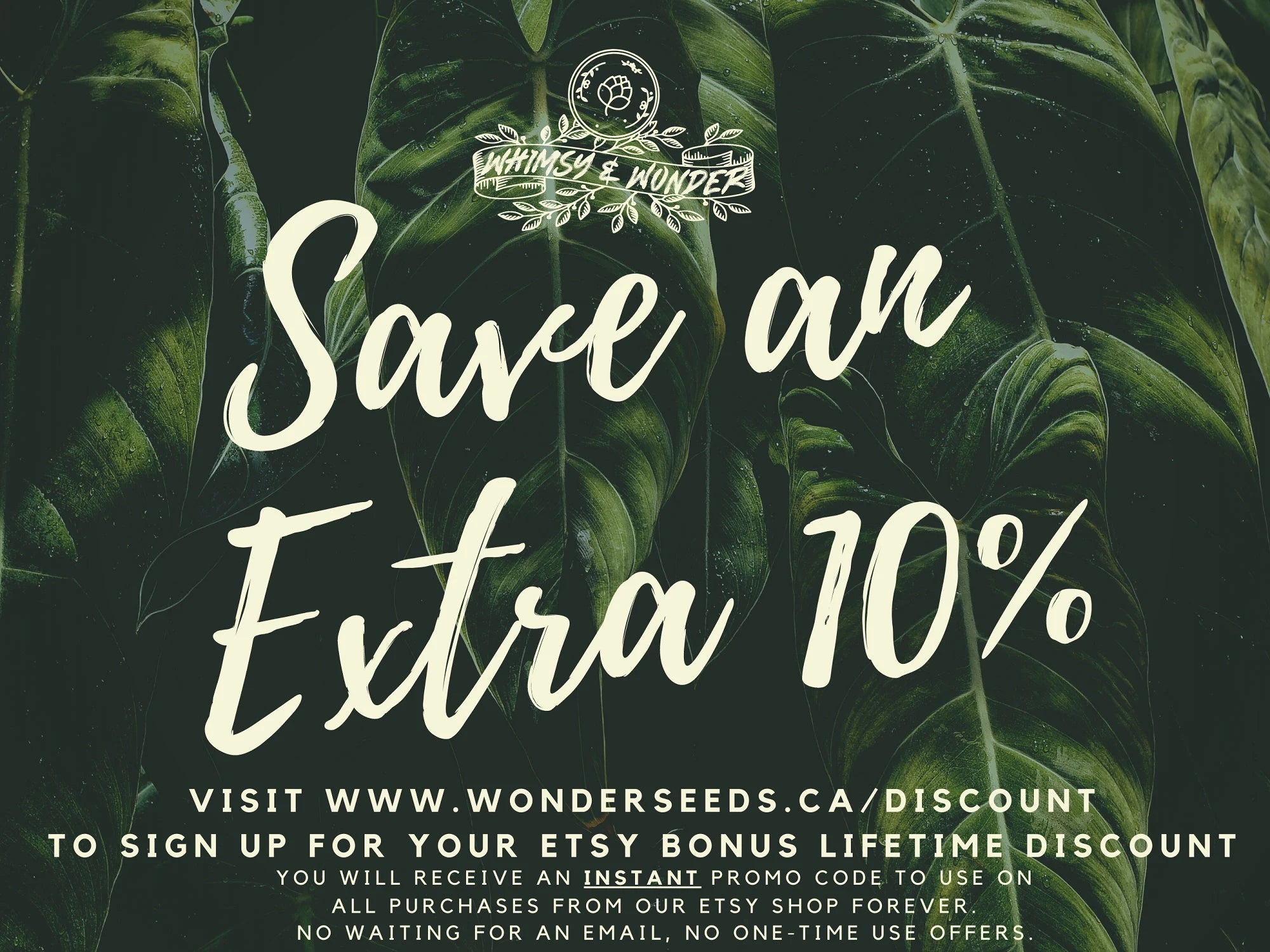 Are you looking for a discount in our Etsy shop? Visit www.wonderseeds.ca/discount to receive a 10% lifetime discount. This can even be applied to any sale items on our Etsy shop. This discount is INSTANT .... no waiting for an email. Best of all..... you can use this coupon forever, its not a one time use discount!!!